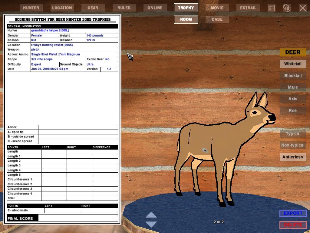 GAME SERVERS IP ADDRESS Granddad(GDL)82.36.51.239 Open 24/7 Please use ENGLISH when talking on server thank u. HI IF ANY ONE INCLUDING NON MEMBERS KILL A WR. EXPORT IT AND SEND IT IN AND WE WILL POST IT ON WEBSITE. SEND TO EITHER EMAILS ON FRONT WEBSITE. DH2005 GAME SERVER IP.. 82.36.51.239 IS OPEN TO ALL . SEE IF YOU CAN BEAT THE SCORE ON SCREEN AND GET YOUR KILL UP THERE FOR THE DAY. SCORE RESETS MIDNIGHT. Hi if your dh2005 v 1.2 does not play full screen replace aspen. dll and stags head in game folder, with aspen .dll and stags head in the patch found in downloads. HI WE HAVE SAT NIGHT HUNTS FROM 7PM UK TIME USING 5 STANDARD MAPS. IF YOU WANT TO JOIN IN PLEASE DO SO. WE ALSO HAVE WEEKLY COMPETITIONS FOR FUN, ANY IDEAS WELCOME. MEMBERSHIP AND DOWNLOADS ARE FREE. MEMBERSHIP IS JUST A FEW SIMPLE STEPS . THANK YOU FROM ALL AT (GDL). Hunter Skills by beardy The Game by beardy Hunting Tips by beardy WR/RB, Top Weight/Value Chart by beardy Rarity chart by beardy How To Export Trophies by granddad Golden Skins by beardy Trophies by beardy Rankings by beardy Hotspots by beardy How to install Teamspeak 3 by granddad DH 2005 Servers IP by granddad | Game sever ip 82.43.121.61 We are looking for members to keep the game running it's FREE just email grahammerrifield@gmail.com to say u would like to join.Our game server is open 24/7 to any 1. FEE to play on so come and see if you can get your name up in light's with best kill.Hope to see u soon. 82.43.121.61