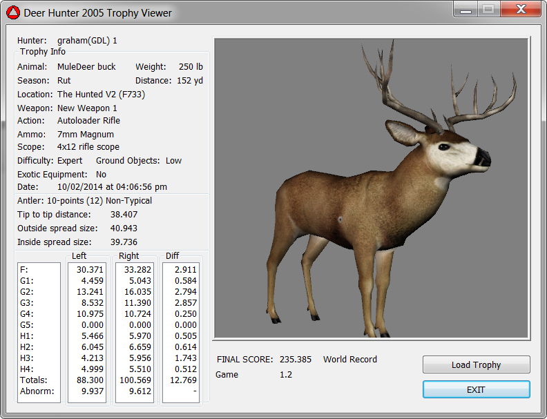 GAME SERVERS IP ADDRESS Granddad(GDL)82.36.51.239 Open 24/7 Please use ENGLISH when talking on server thank u. HI IF ANY ONE INCLUDING NON MEMBERS KILL A WR. EXPORT IT AND SEND IT IN AND WE WILL POST IT ON WEBSITE. SEND TO EITHER EMAILS ON FRONT WEBSITE. DH2005 GAME SERVER IP.. 82.36.51.239 IS OPEN TO ALL . SEE IF YOU CAN BEAT THE SCORE ON SCREEN AND GET YOUR KILL UP THERE FOR THE DAY. SCORE RESETS MIDNIGHT. Hi if your dh2005 v 1.2 does not play full screen replace aspen. dll and stags head in game folder, with aspen .dll and stags head in the patch found in downloads. HI WE HAVE SAT NIGHT HUNTS FROM 7PM UK TIME USING 5 STANDARD MAPS. IF YOU WANT TO JOIN IN PLEASE DO SO. WE ALSO HAVE WEEKLY COMPETITIONS FOR FUN, ANY IDEAS WELCOME. MEMBERSHIP AND DOWNLOADS ARE FREE. MEMBERSHIP IS JUST A FEW SIMPLE STEPS . THANK YOU FROM ALL AT (GDL). Hunter Skills by beardy The Game by beardy Hunting Tips by beardy WR/RB, Top Weight/Value Chart by beardy Rarity chart by beardy How To Export Trophies by granddad Golden Skins by beardy Trophies by beardy Rankings by beardy Hotspots by beardy How to install Teamspeak 3 by granddad DH 2005 Servers IP by granddad | Game sever ip 82.43.121.61 We are looking for members to keep the game running it's FREE just email grahammerrifield@gmail.com to say u would like to join.Our game server is open 24/7 to any 1. FEE to play on so come and see if you can get your name up in light's with best kill.Hope to see u soon. 82.43.121.61