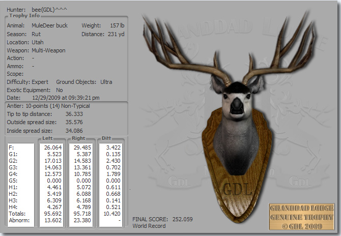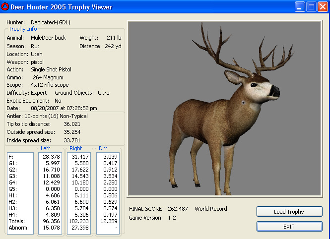 GAME SERVERS IP ADDRESS Granddad(GDL)82.36.51.239 Open 24/7 Please use ENGLISH when talking on server thank u. HI IF ANY ONE INCLUDING NON MEMBERS KILL A WR. EXPORT IT AND SEND IT IN AND WE WILL POST IT ON WEBSITE. SEND TO EITHER EMAILS ON FRONT WEBSITE. DH2005 GAME SERVER IP.. 82.36.51.239 IS OPEN TO ALL . SEE IF YOU CAN BEAT THE SCORE ON SCREEN AND GET YOUR KILL UP THERE FOR THE DAY. SCORE RESETS MIDNIGHT. Hi if your dh2005 v 1.2 does not play full screen replace aspen. dll and stags head in game folder, with aspen .dll and stags head in the patch found in downloads. HI WE HAVE SAT NIGHT HUNTS FROM 7PM UK TIME USING 5 STANDARD MAPS. IF YOU WANT TO JOIN IN PLEASE DO SO. WE ALSO HAVE WEEKLY COMPETITIONS FOR FUN, ANY IDEAS WELCOME. MEMBERSHIP AND DOWNLOADS ARE FREE. MEMBERSHIP IS JUST A FEW SIMPLE STEPS . THANK YOU FROM ALL AT (GDL). Hunter Skills by beardy The Game by beardy Hunting Tips by beardy WR/RB, Top Weight/Value Chart by beardy Rarity chart by beardy How To Export Trophies by granddad Golden Skins by beardy Trophies by beardy Rankings by beardy Hotspots by beardy How to install Teamspeak 3 by granddad DH 2005 Servers IP by granddad | Game sever ip 82.43.121.61 We are looking for members to keep the game running it's FREE just email grahammerrifield@gmail.com to say u would like to join.Our game server is open 24/7 to any 1. FEE to play on so come and see if you can get your name up in light's with best kill.Hope to see u soon. 82.43.121.61